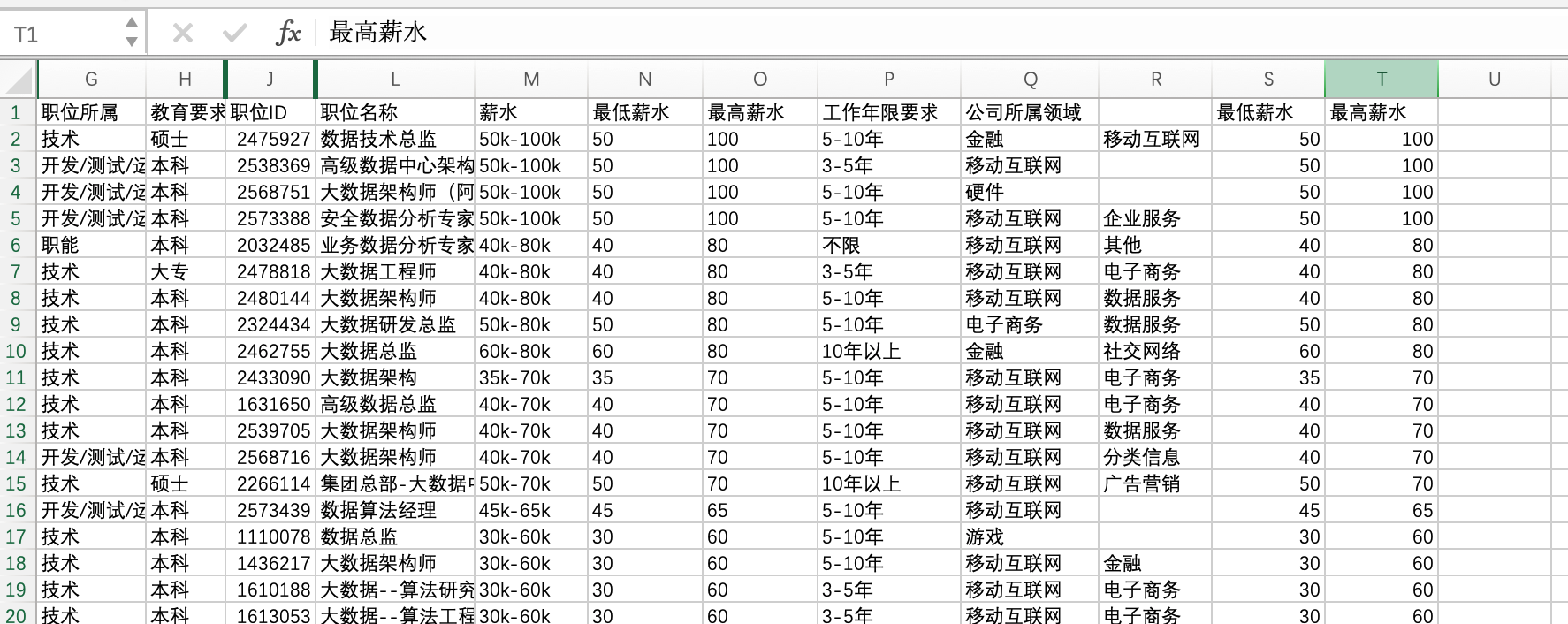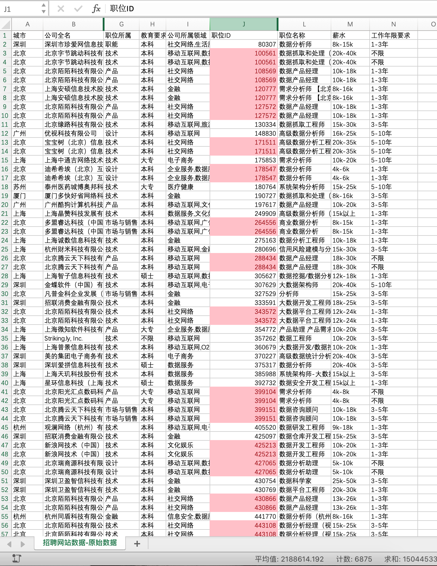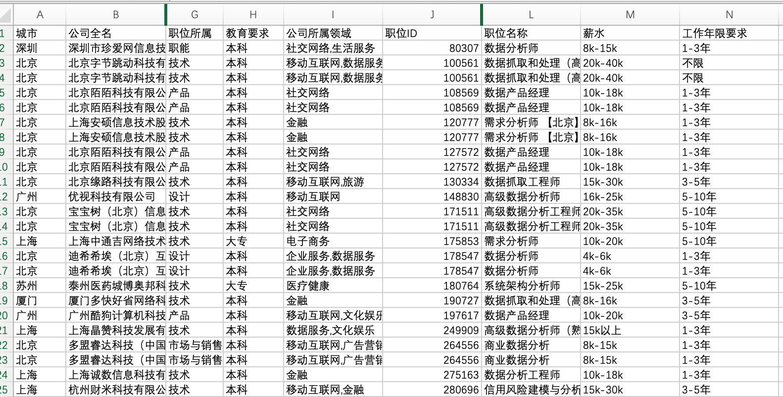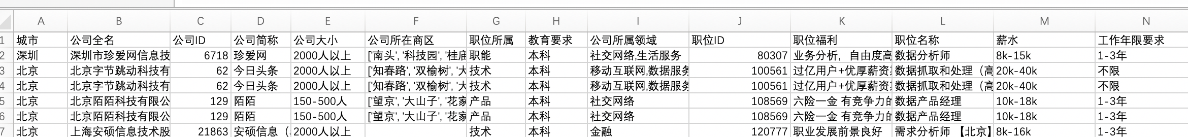 城市:因为需要分析不同城市的情况,还会做出对比,因此城市是分析必用的职位ID:在数据无重复情况下,职位ID应当是每个招聘岗位的唯一ID,是必须用到的职位名称:此表中职位名称并没有一个统一,还有些非数据分析师岗位名称,后面处理数据时需要用到薪水:必用的工作年限要求:必用的