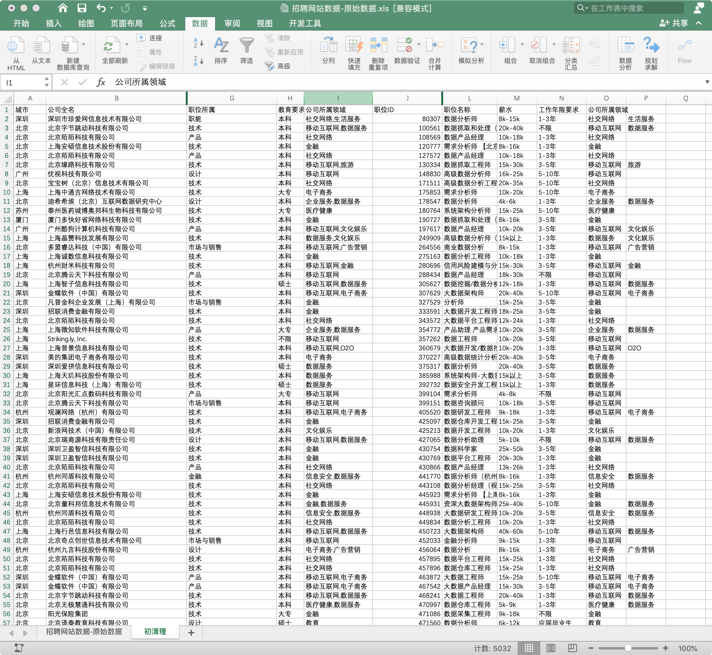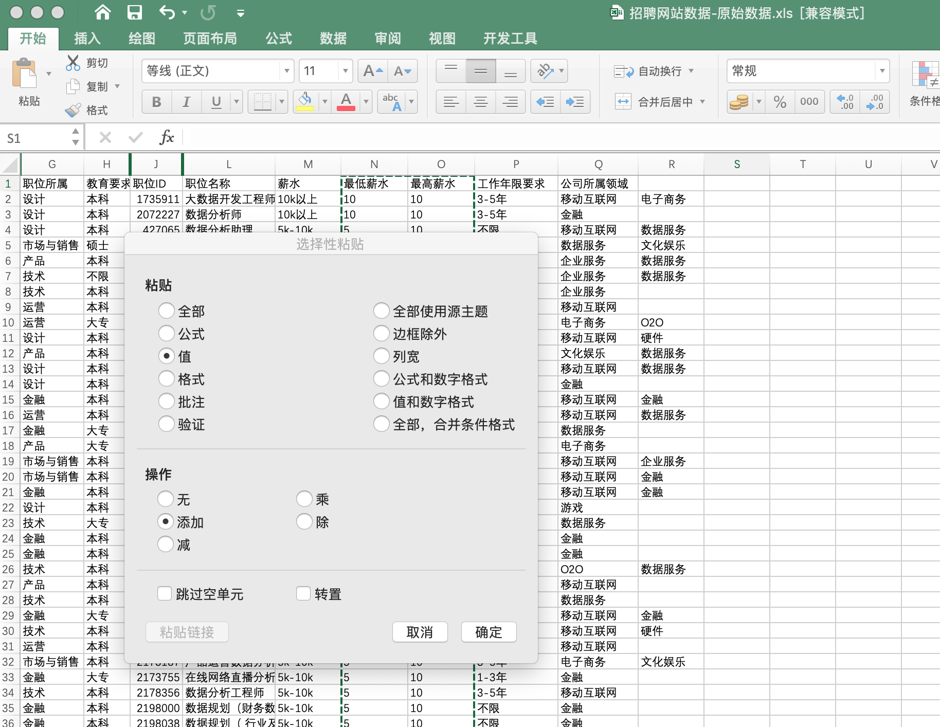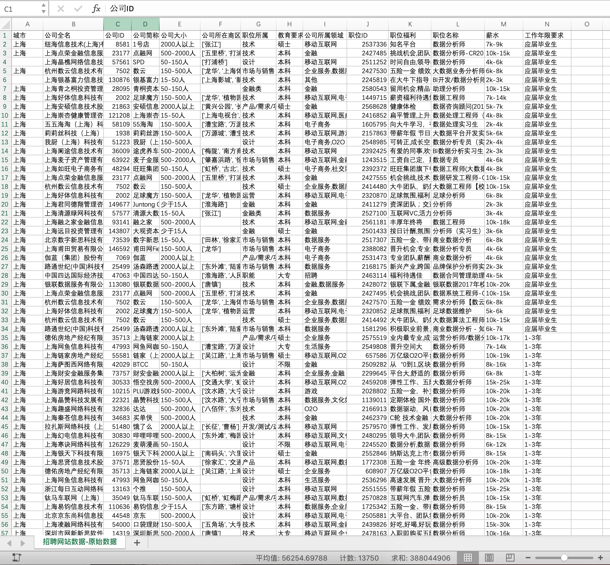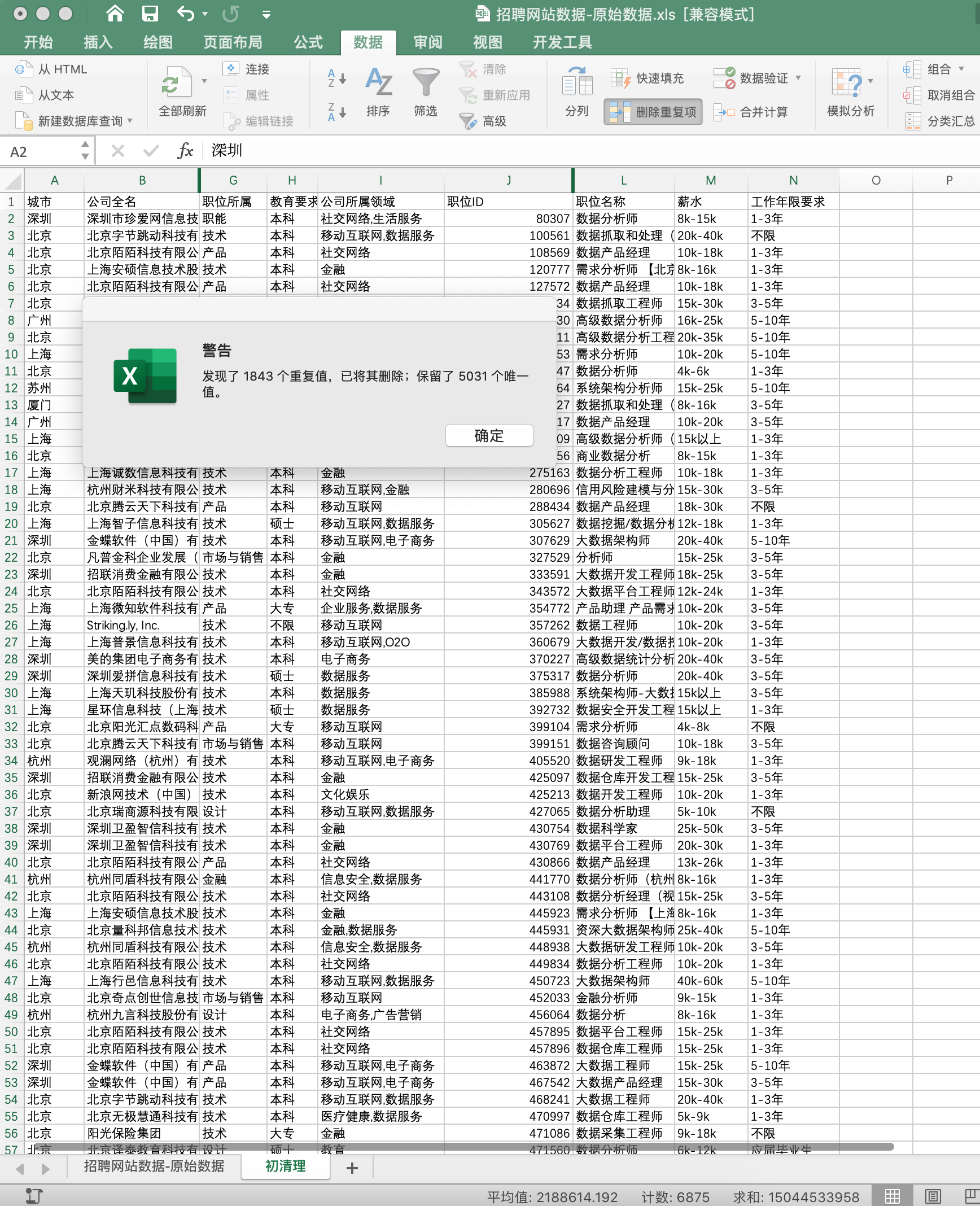 城市:因为需要分析不同城市的情况,还会做出对比,因此城市是分析必用的职位ID:在数据无重复情况下,职位ID应当是每个招聘岗位的唯一ID,是必须用到的职位名称:此表中职位名称并没有一个统一,还有些非数据分析师岗位名称,后面处理数据时需要用到薪水:必用的工作年限要求:必用的