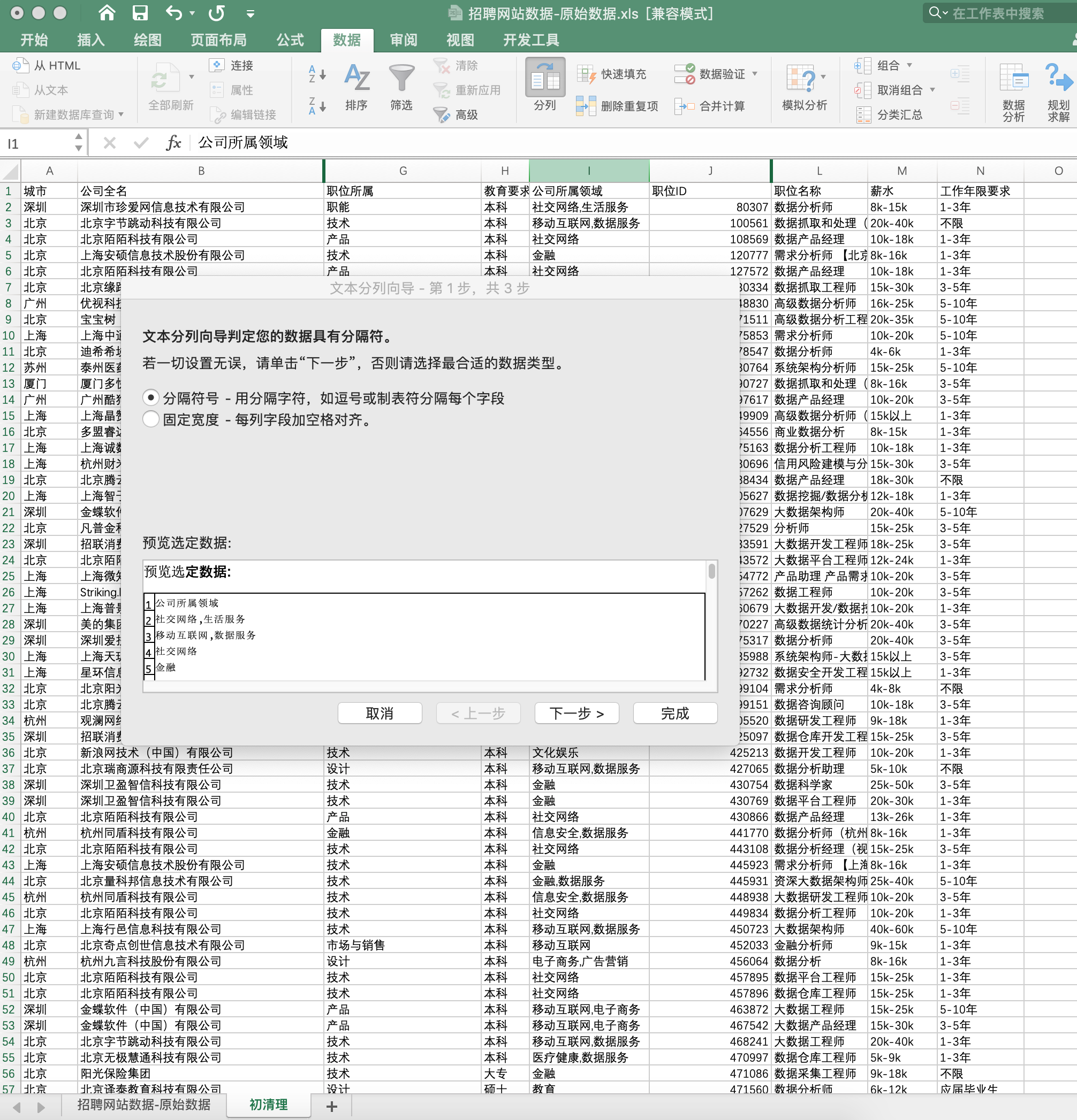 数据表中 公司所属领域 这一列,有些公司从属于一个行业,有些公司则从属于两个行业,此时需要将这两个行业分割开来。使用 分列。