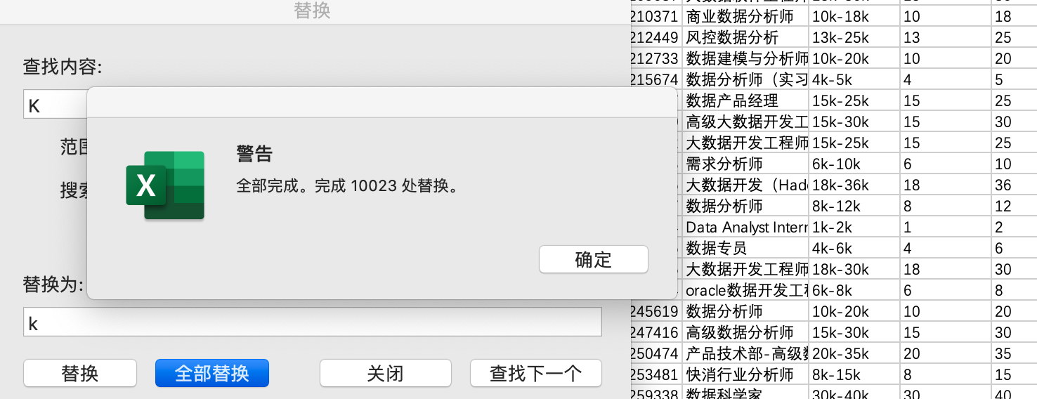 观察发现 薪水列中数据有出现大小写K/k混用情况,先将他们统一替换成小写k