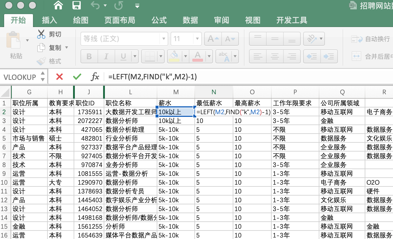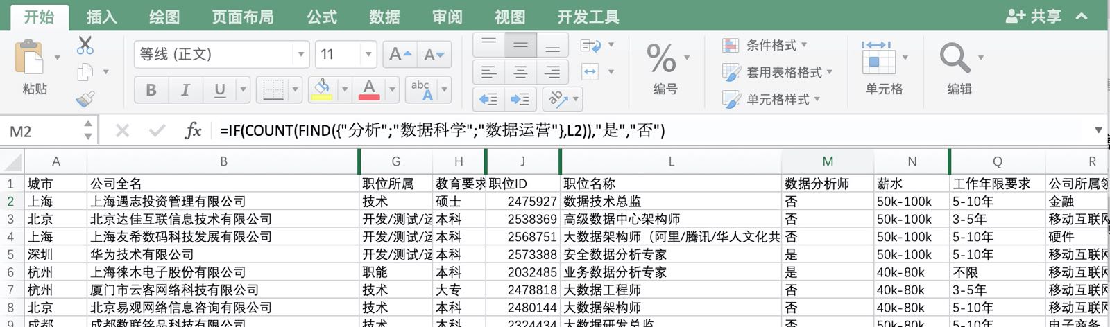 新建一列表名“数据分析师”,使用函数IF/COUNT/FIND,如果单元格中含有“分析”、“数据科学”、“数据运营”,则返回“是”
