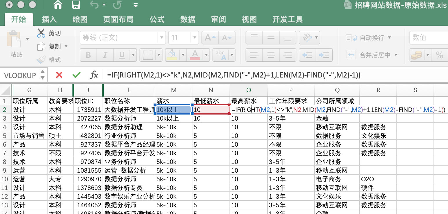 因 薪水 中一些单元格内是“xx以上”或“xx以下”,不能直接套用复合函数,我们可以先对单元格进行判断,不是以 “k”结束的单元格,最高薪水暂定与最低薪水相同。