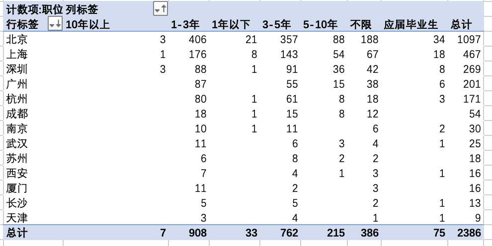 如前面提到,想要知道不同城市的数据分析师招聘岗位对不同工作年限的人是怎样的需求情况,利用数据透视功能,得到以下数据透视表:
