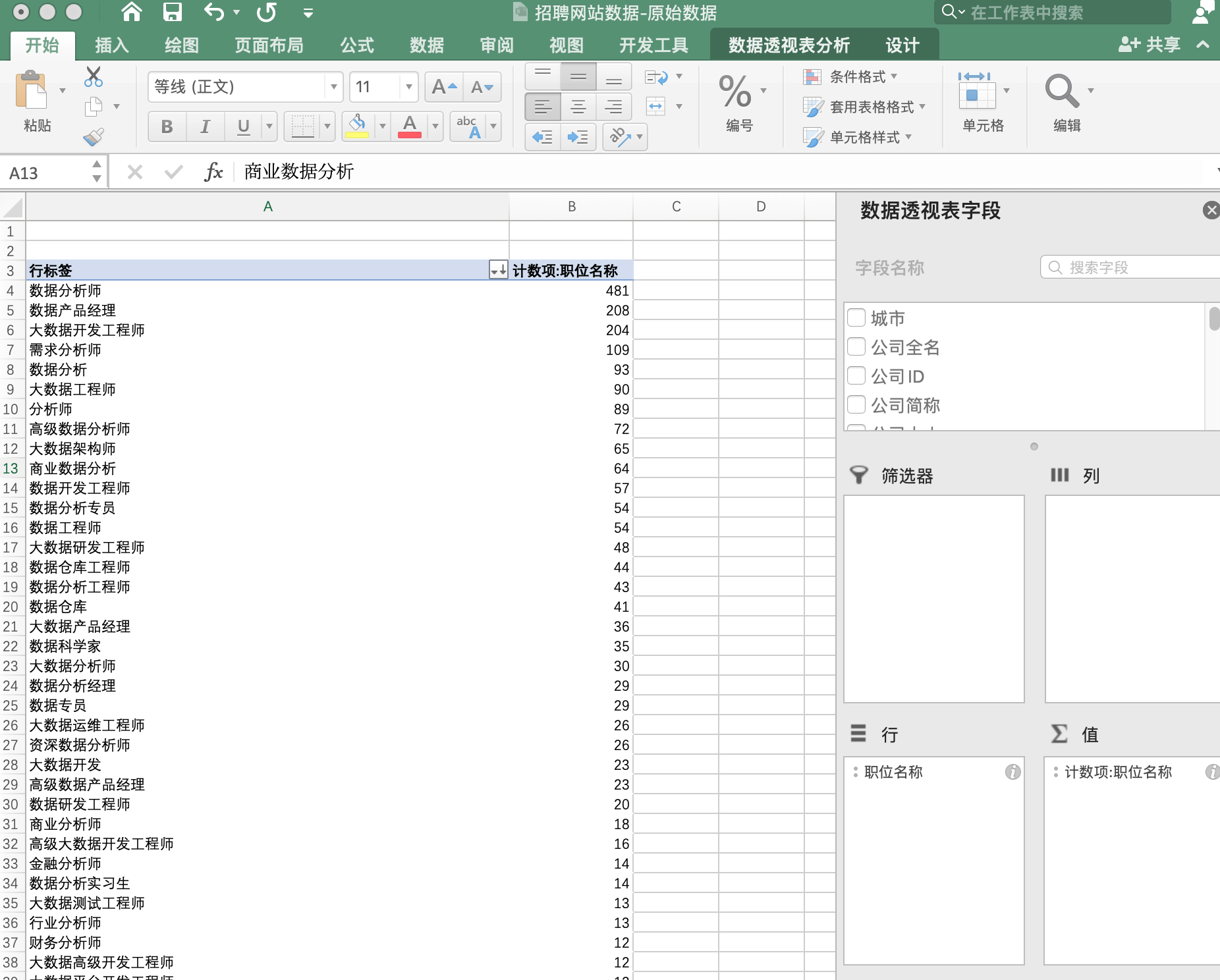 职位名称 列内职位名称种类非常多,有些甚至不是数据分析师,需要先初步判断下那些需要留存。