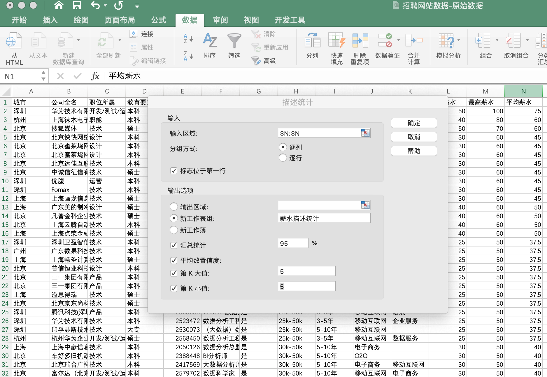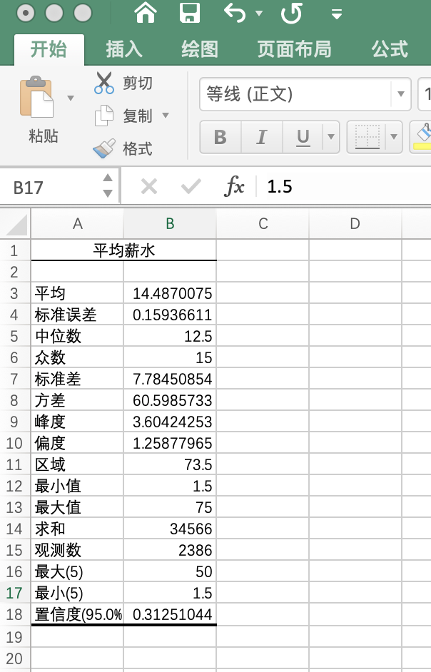利用“描述性统计”功能可以堆平均薪资进行分析,