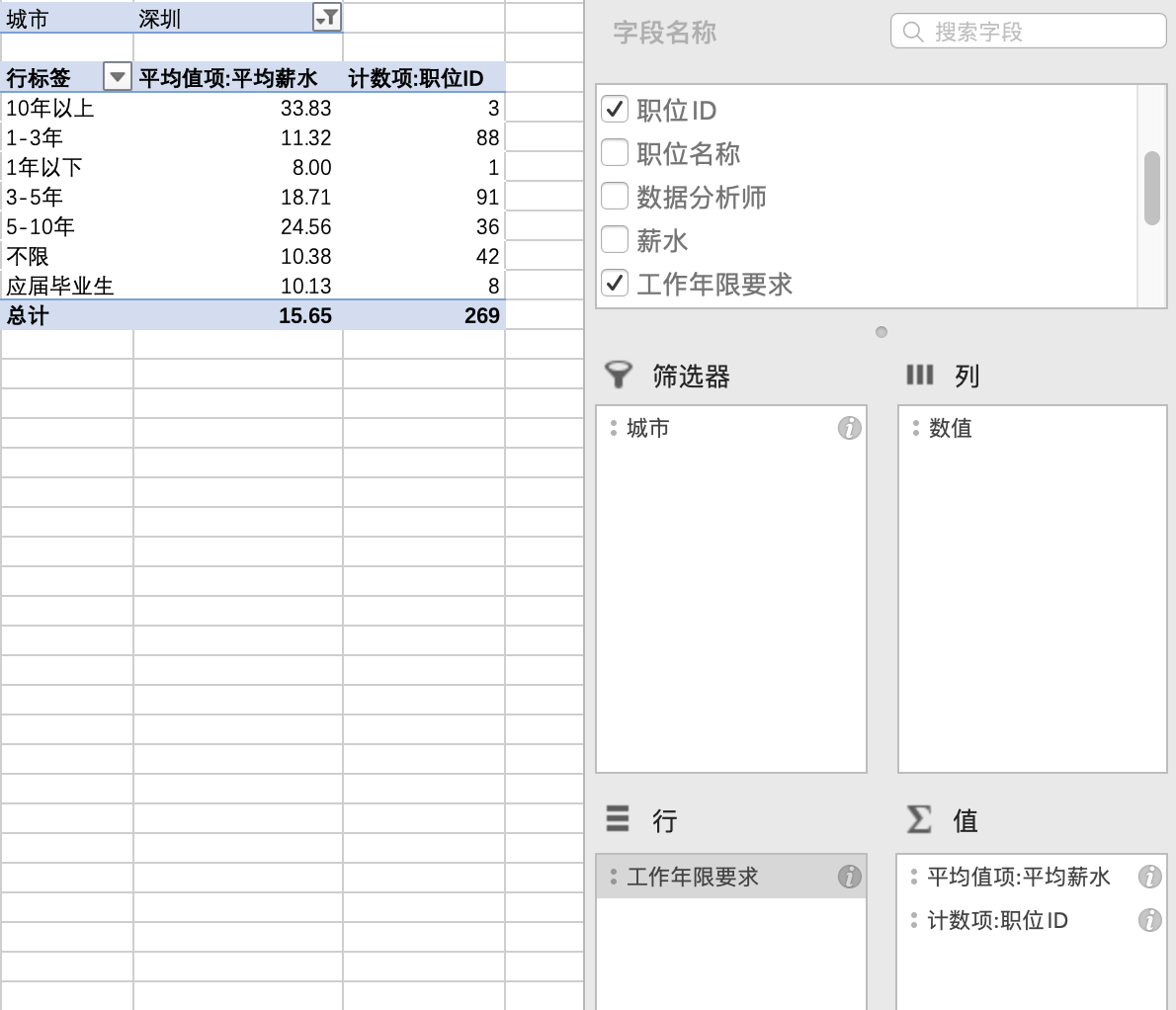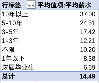 想要获取不同工作年限的岗位提供的薪资水平情况,可得到以下数据透视表: