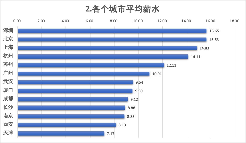 - 从各城市平均薪水表可以看到,该岗位在深圳的薪水最高,其次是北京、上海