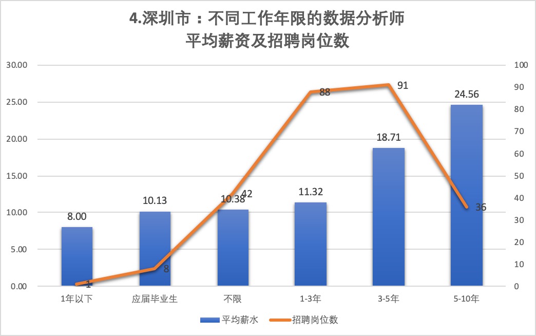 - 深圳市不同工作年限数据分析师的平均薪水和需求对比